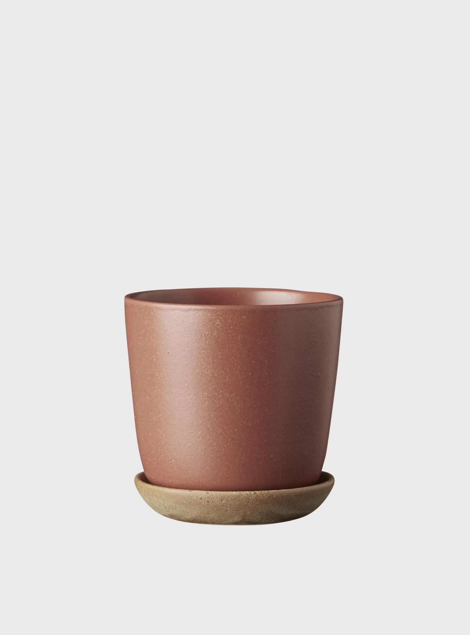 -Glazed with a matte ‘speckle’ glaze with uncoated raw saucer.