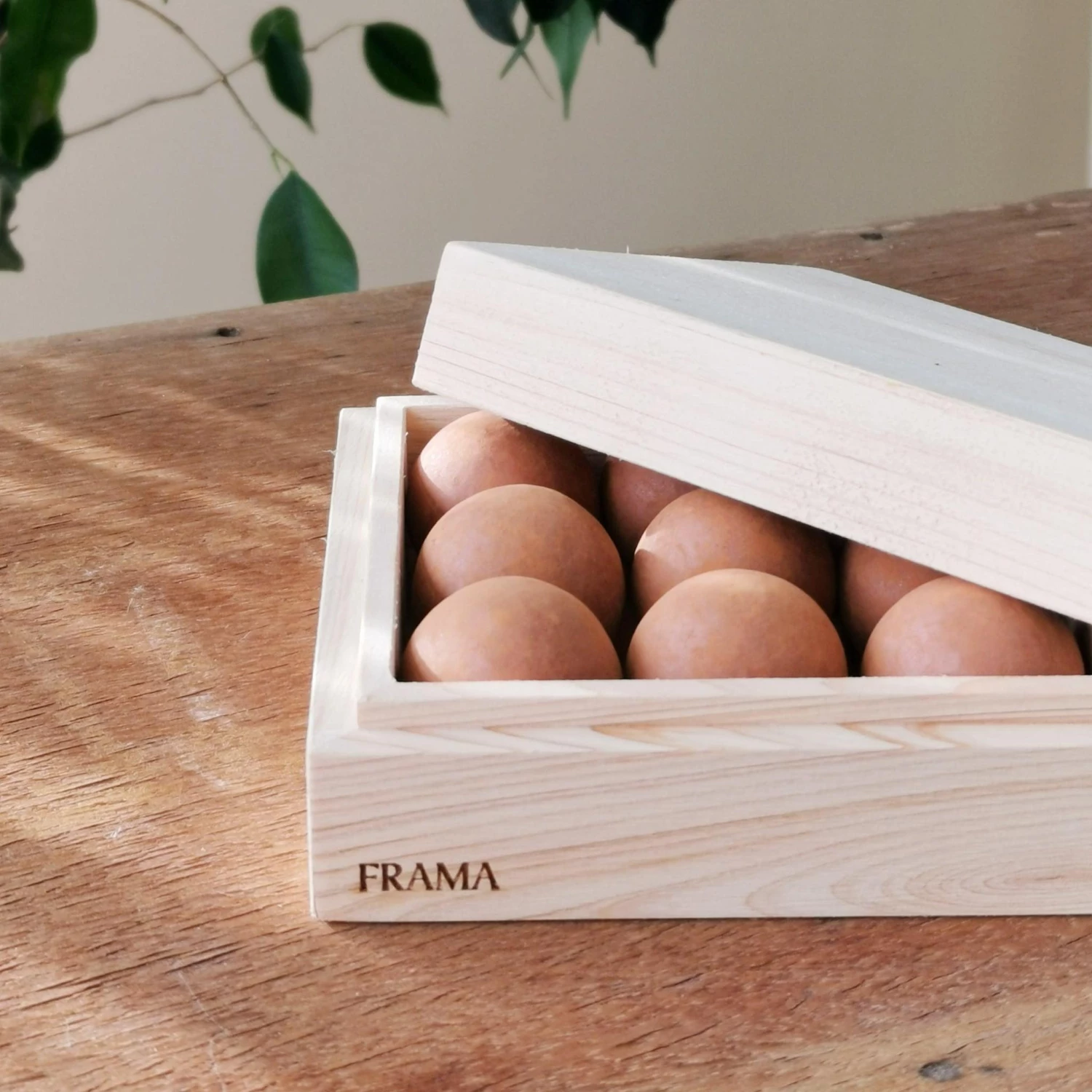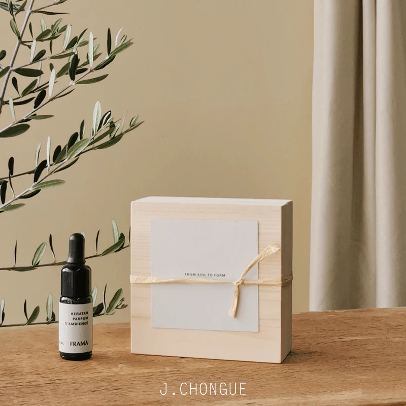 From Soil to Form is a natural room diffuser made out of Korean soil and wood. The diffuser consists of a pinewood box that holds nine red soil spheres upon which oil fragrances are to be dropped. It may be used indefinitely to disperse the carefully crafted Apothecary scents. From Soil to Form is created in collaboration with the creative branding Studio; Be My Guest, based in Seoul.