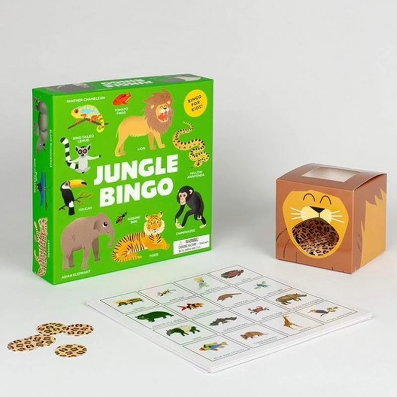 Jungle Bingo contains 48 illustrated animal chips and a cardboard creature’s head to store them in, a game board, eight double-sided bingo cards, and jungle counters for you to mark up your card.