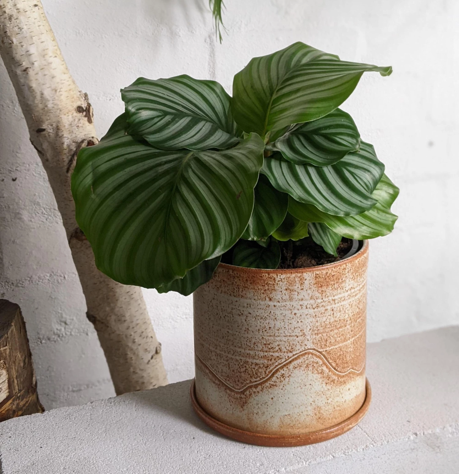 The wide range of patterning and textures in the Calathea genus vary greatly, so you’re sure to find the perfect foliage to layer with in your home. Their vividly patterned leaves are typically oval shaped with strong leaf veining and marking. Peacock plants are best placed on the floor or tabletop. If placed at the right height, you’ll easily see the brightly coloured underside of the leaves.