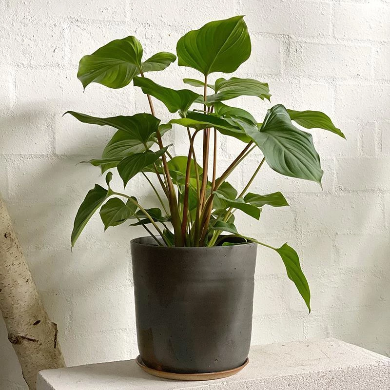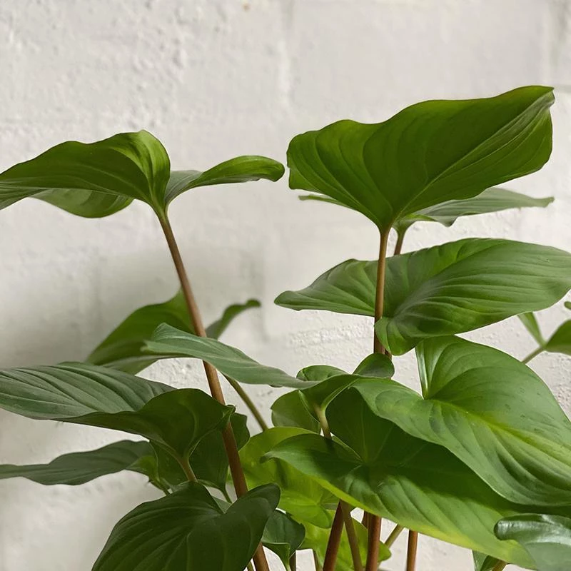 These plants have glossy heart-shaped leaves on the end of long red petioles. Some varieties have intense markings while others have simple, plain green leaves. This tall and slender houseplant can be easy-care or more difficult, depending on the variety. They are perfect for group planting on a
