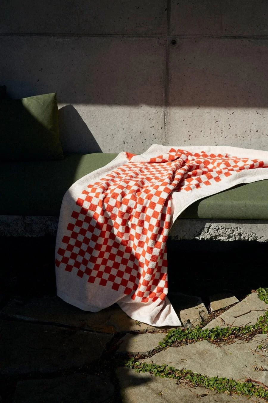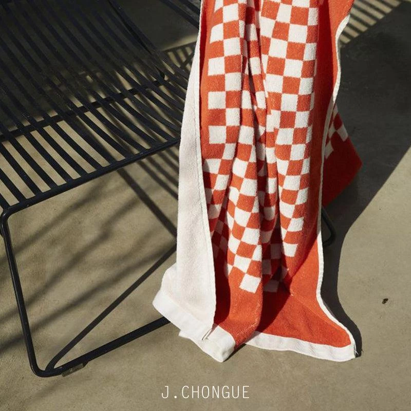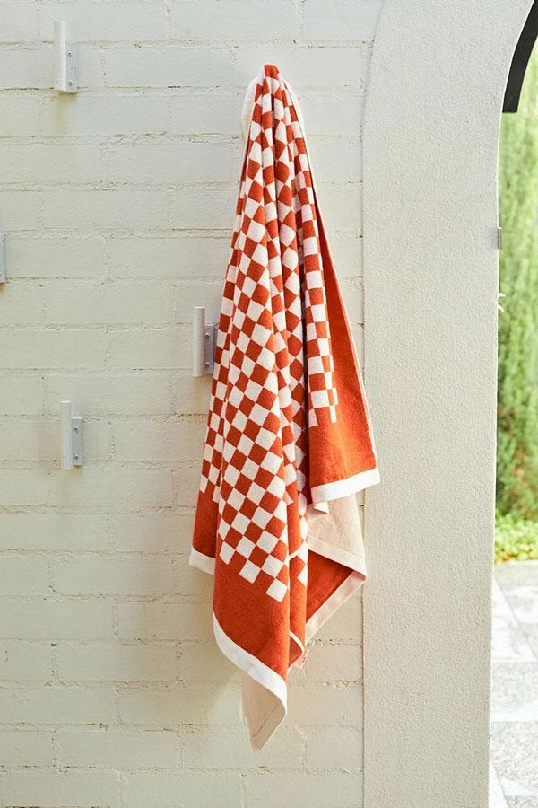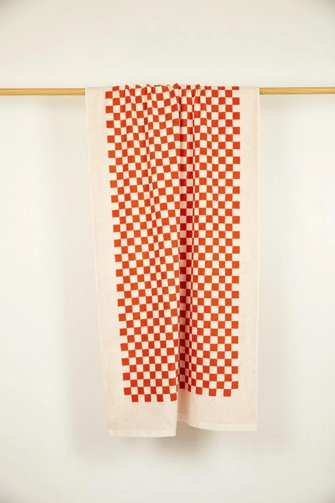 100% Organic Cotton pool towel or bath sheet. This playful towel in checkerboard print, synonymous with the Baina brand features a reversible colourway. The bright Paloma Sun (red) checkerboard contrasting against the Ecru (fawn) makes a statement in any bathroom or on any beach.