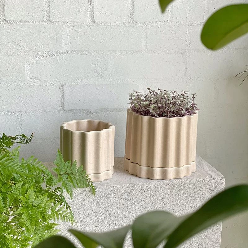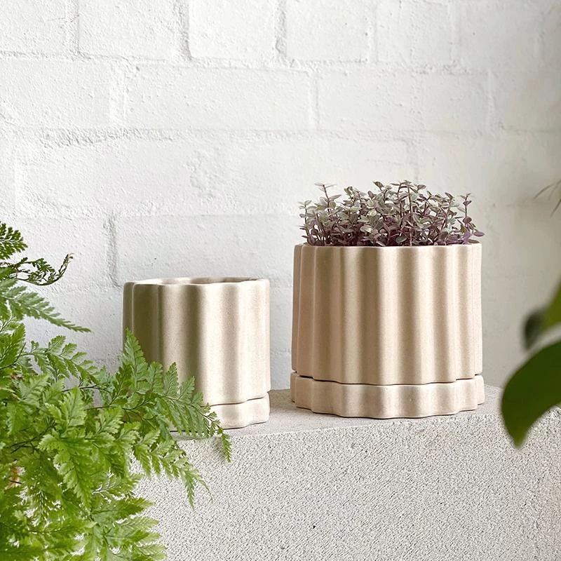 Ella Reweti is a ceramic artist living and working in Melbourne. Her distinctive range of vases and planters vary by height and colour, but all present the same surface of soft, corrugated forms, which cast an exquisite ridged silhouette.